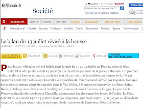 So what this article says is that basically during the night of 13 to 14 July more than 500 cars were set ablaze. By whom? No one knows. Everyone's clueless. Must be Greys from Zeta Reticuli, pissed off by all that Blue, White and Red. Or US Marines. Belgians. Whatever. Anyway, the first estimation made at 6 o'clock in the morning came to 317 vehicles, 6.7% up from the previous year, when there were only 297. Police nevertheless qualified the night as "relatively calm", although "serious" incidents took place in Val d'Oise, Gonesse, Arnouville, Seine-Saint-Denis, Aulnay-sous-Bois, Tremblay-en-France, and in l'Essonne, in Grigny. The newspaper La Provence signaled incidents in Marseille, more precisely shooting at the police. Etc etc etc. Bon Dieu.